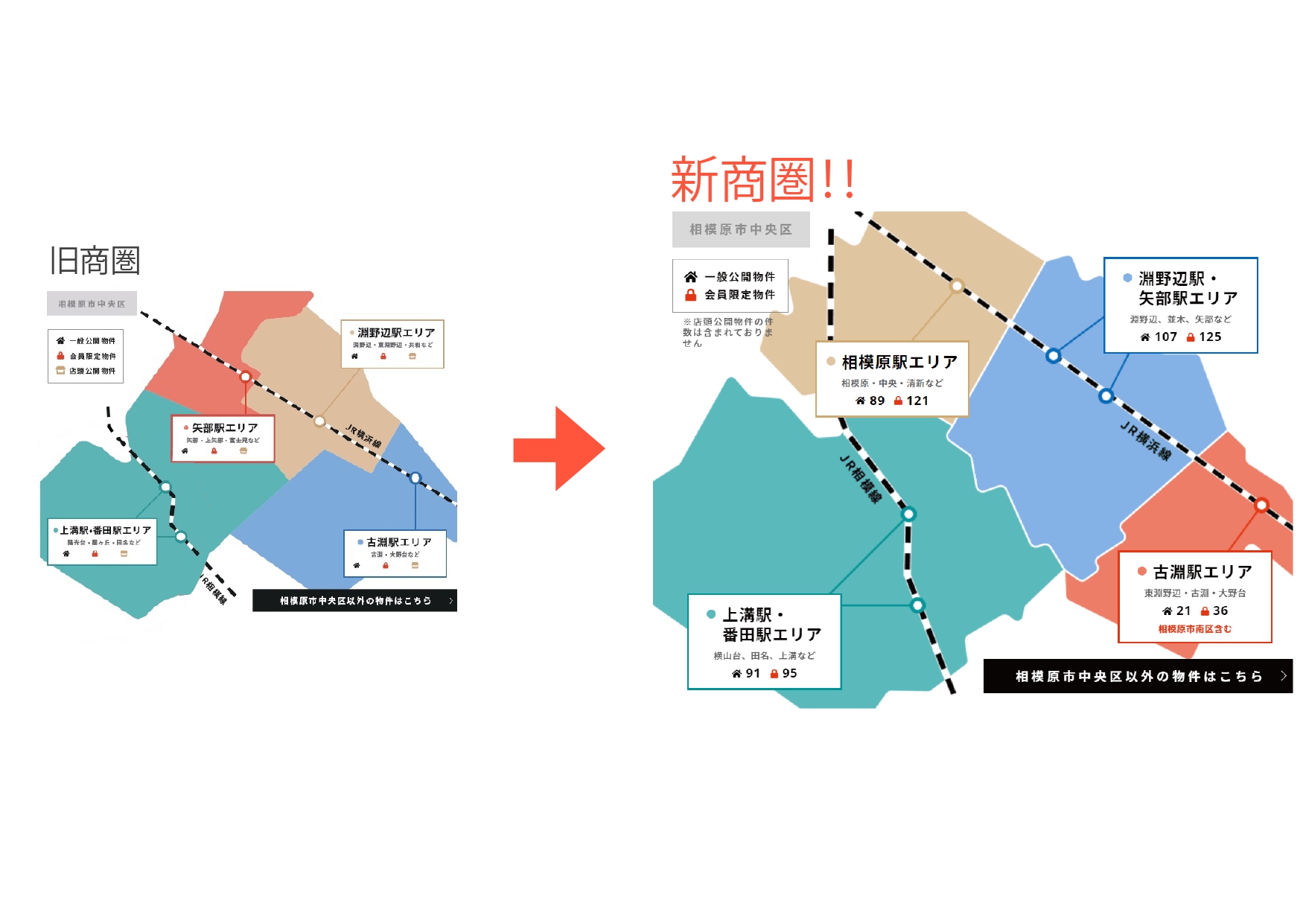以前からご紹介していた古淵・淵野辺・矢部の周辺エリアに加え、マンションの多い相模原や南橋本、新築分譲がでた横山台など相模原市中央区のすべての物件を見ていただくことができます!