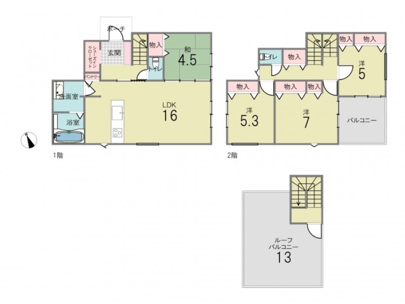 - 食器洗浄乾燥機、シャンプードレッサー、ウォシュレット、浴室TV、複層ガラス、モニタ付インターホン、駐車場2台分、 トイレ2箇所、床下収納、ルーフバルコニー
