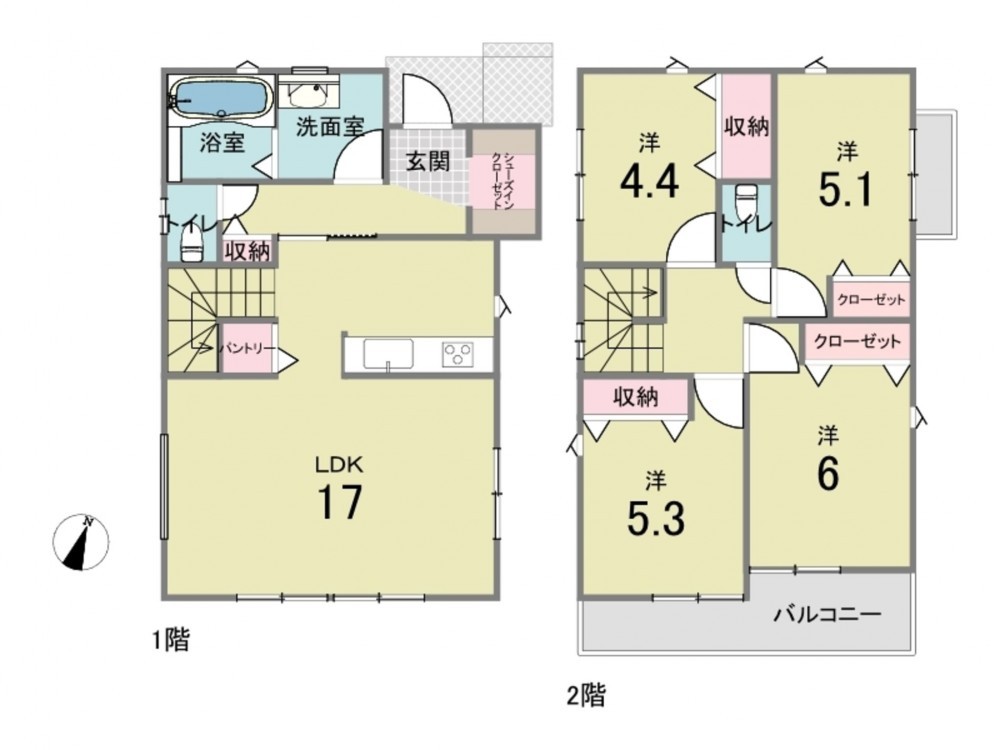 - カウンターキッチン、浴室乾燥機、ウォシュレット、シューズインクローゼット、駐車場2台分、 トイレ2箇所