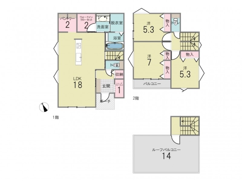 - ウォークインクローゼット、駐車場2台分、 トイレ2箇所、床下収納、ルーフバルコニー