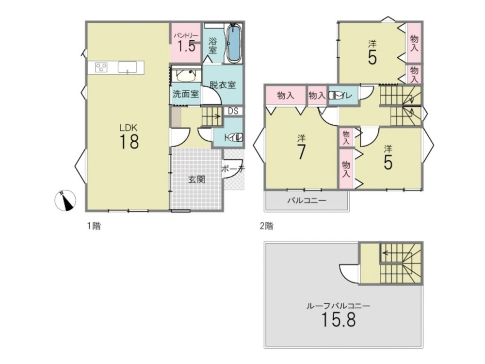 - 駐車場2台分、 トイレ2箇所、床下収納、ルーフバルコニー