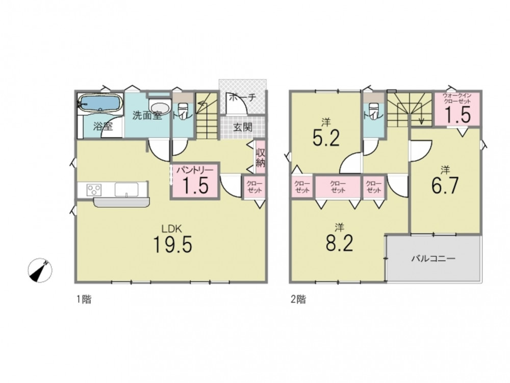 - カウンターキッチン、浴室乾燥機、シャンプードレッサー、ウォシュレット、ウォークインクローゼット、複層ガラス、モニタ付インターホン、駐車場3台分、 トイレ2箇所、床下収納、24時間換気システム、平坦地